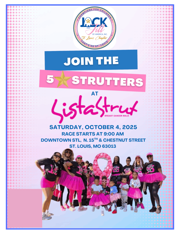 Join the 5-Star Sensational St. Louis Chapter of Jack & Jill of America, Inc. at the Sista Strut. The 5-Star Strutters are gearing up, and Moms, we want YOU on the team! Let’s show up big, bold, and full of sisterhood as we walk for a cause that matters. Let’s strut our stuff together!