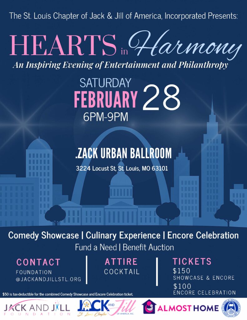 Hearts in Harmony: An Inspired Evening of Entertainment and Philanthropy, on February 28, 2026, at 6:00 p.m. The .ZACK Urban Ballroom (Kranzberg Arts Foundation), 3224 Locust Street, St. Louis, MO.